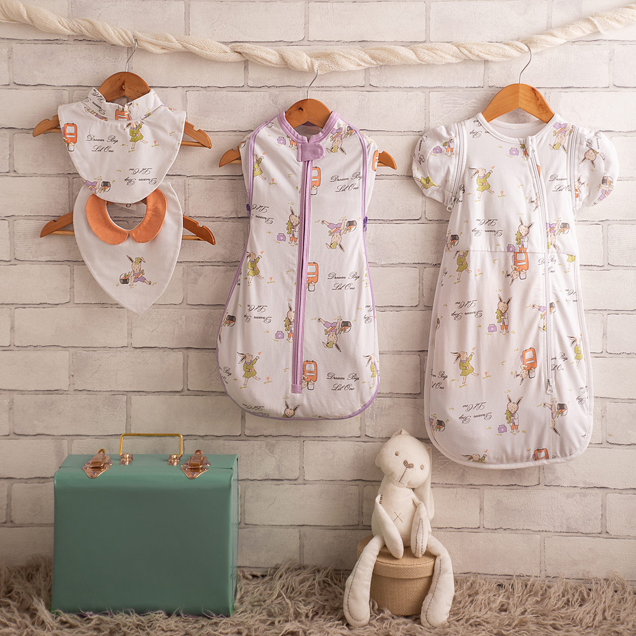 2 sleeping bags ( 1 sleeping bags is for 0-6 months the other one is for 6-12 months ) + 2 bibs which can be used till 18-24 months easily.